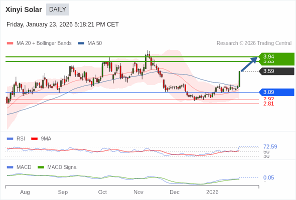 Comment: the RSI is above 70. It could mean either that the price is in a lasting uptrend or just overbought and therefore bound to correct (look for bearish divergence in this case). The MACD is above its signal line and positive. The configuration is positive. Moreover, the price is above its 20 and 50 period moving average (respectively at 3.16 and 3.20). Finally, the Xinyi Solar is trading above its upper Bollinger band (standing at 3.42).