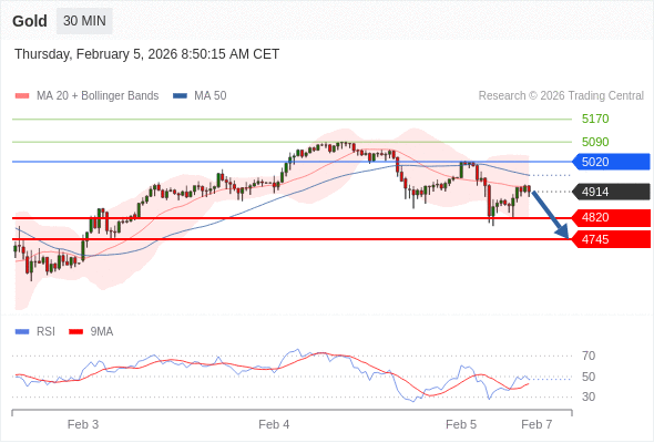Our preference: short positions below 5020 with targets at 4820 & 4745 in extension.