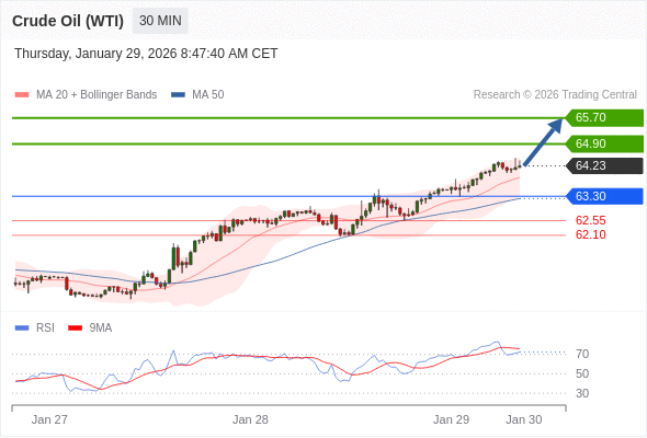 Our preference: long positions above 63.30 with targets at 64.90 & 65.70 in extension.