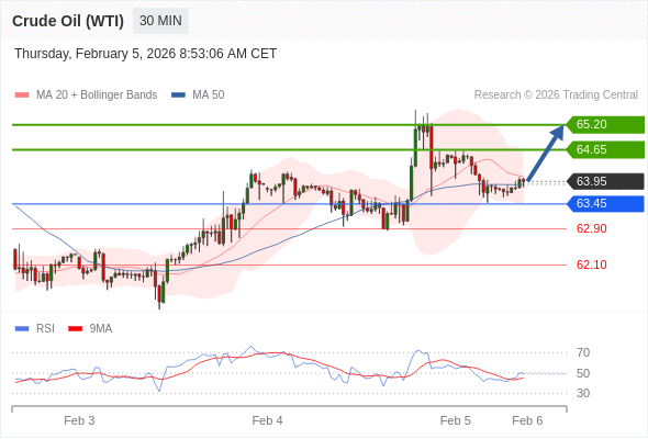 Our preference: long positions above 63.45 with targets at 64.65 & 65.20 in extension.