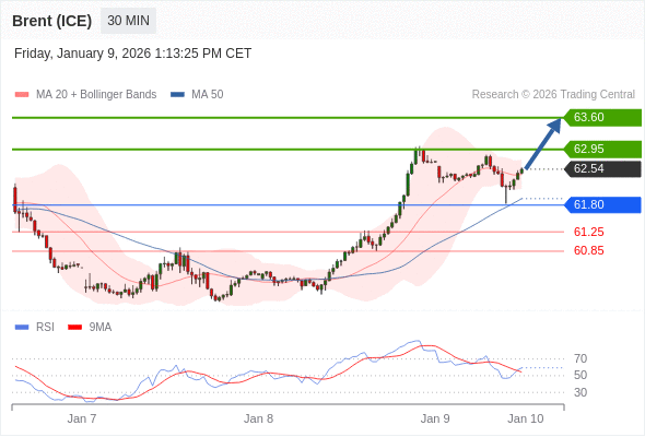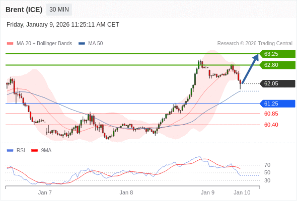 Our preference: long positions above 61.80 with targets at 62.95 & 63.60 in extension.