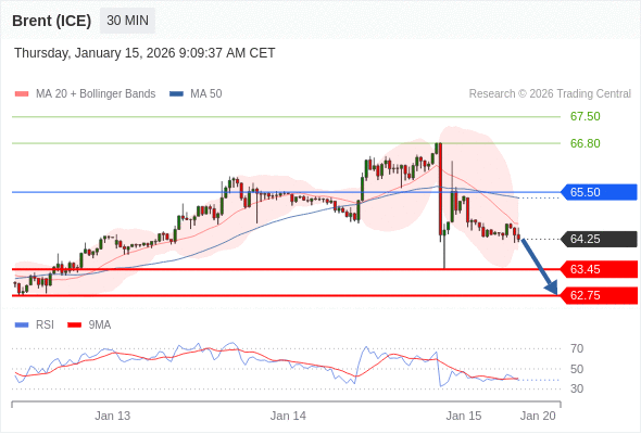 Our preference: short positions below 65.50 with targets at 63.45 & 62.75 in extension.