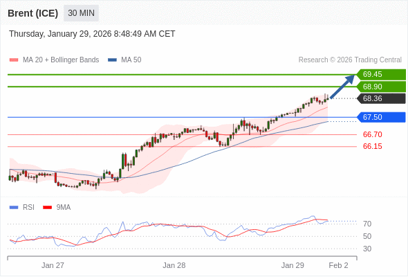 Our preference: long positions above 67.50 with targets at 68.90 & 69.45 in extension.