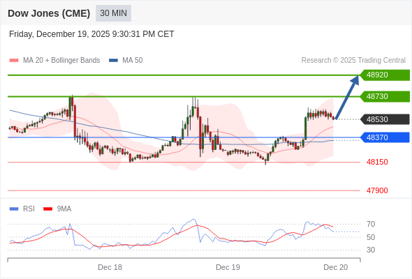 Our preference: long positions above 48370 with targets at 48730 & 48920 in extension.