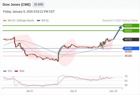 Our preference: long positions above 49450 with targets at 50050 & 50220 in extension.