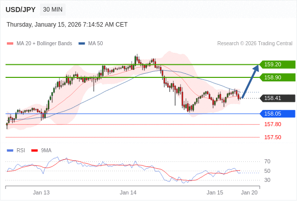 Our preference: long positions above 158.05 with targets at 158.90 & 159.20 in extension.