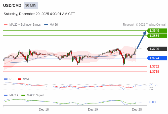 USD/CAD intraday : the upside prevails as long as 1.3774 is support